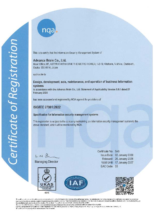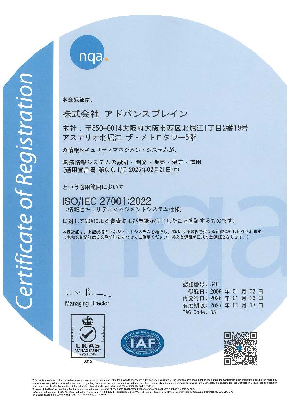 | 審査登録機関 | 株式会社NQA-Japan (http://www.nqa-j.com/ ) |